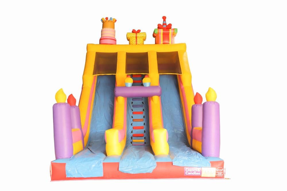 تصميمٌ مُبتكرٌ ومُلفتٌ للنظر: ٢ في واحد نطيطة وزحليقة معنا على شكل كيكة مُزينة بالشموع والهدايا ، تضفي على اللعبة لمسة من الابداع